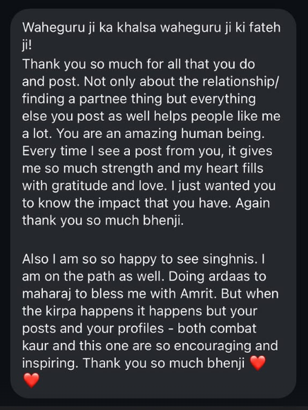 Thank you so much for everything you share. Every time I see one of your posts, it gives me strength and fills my heart with gratitude and love. You’ve helped me on my journey more than you know, and your encouragement has inspired me to walk closer to Sikhi and embrace Amrit when the time is right. Both Combat Kaur and your platform have been such a source of inspiration for me.